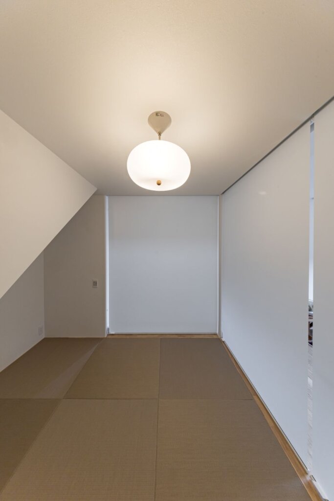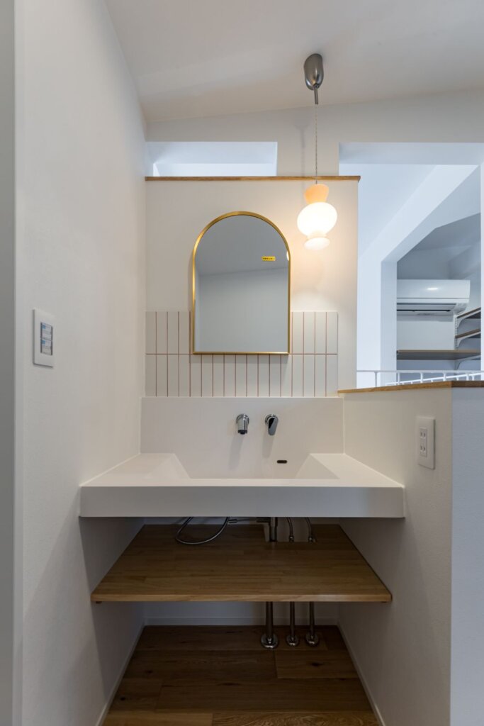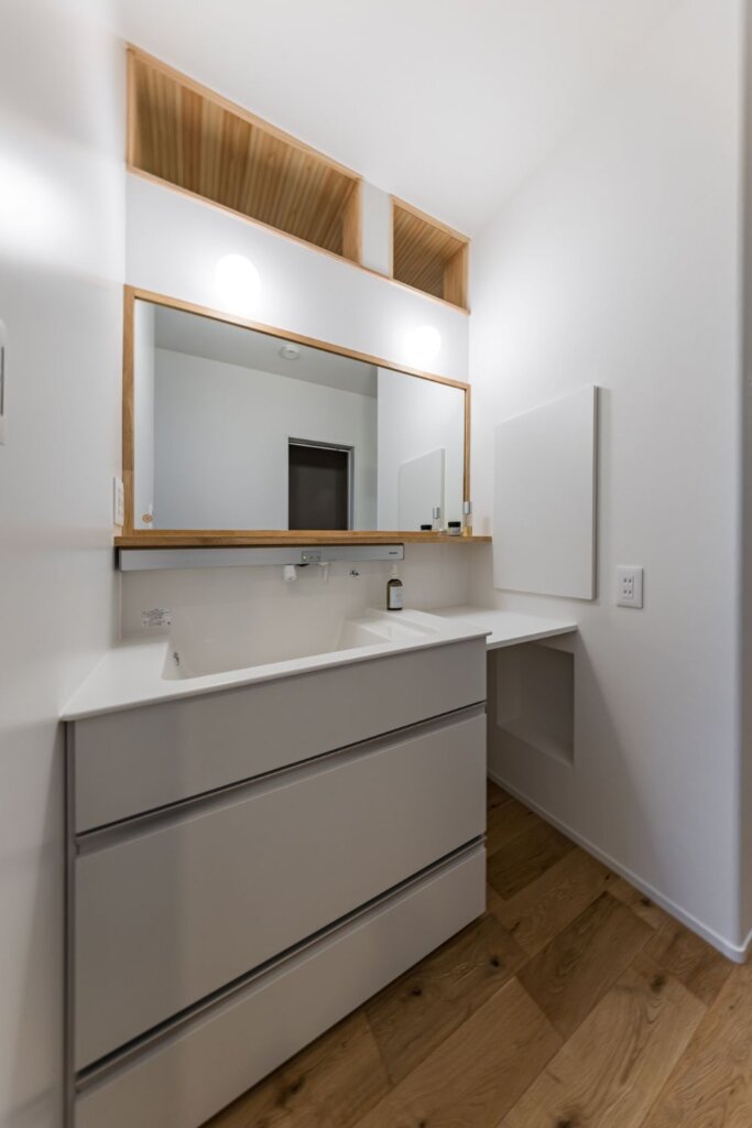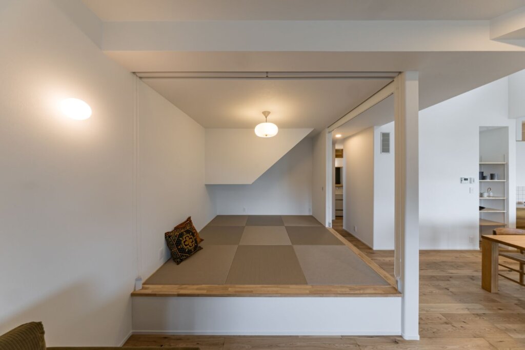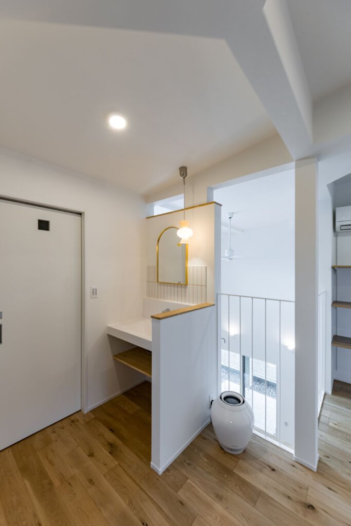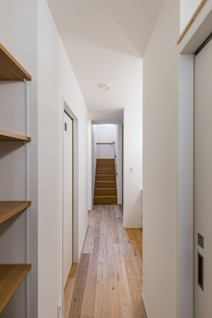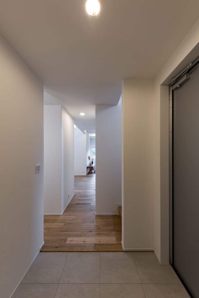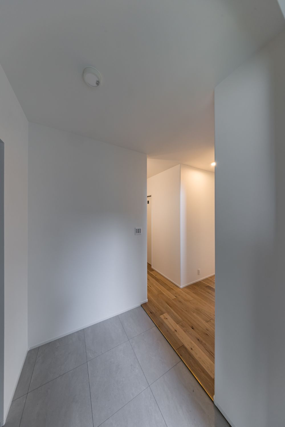 フラットに繋がる玄関スペース。扉がなくても視線を遮る設計で、プライバシーと家族の気配を両立。「掃除もしやすい」という実用的なメリットを加えた、機能美あふれる間取りです。