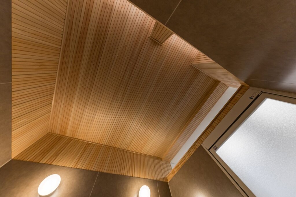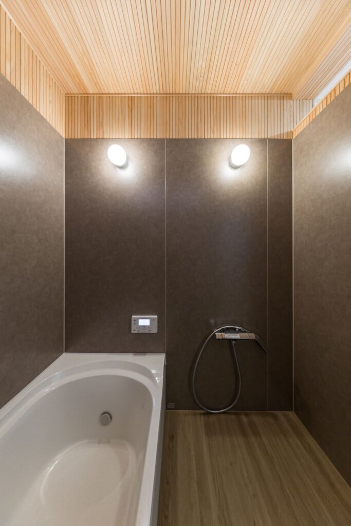 木張りの天井が温泉のように香る浴室。 他室とつながる開口で温度差をなくし、ヒートショックを防ぎます。 デザインと健康を両立したバスルーム。